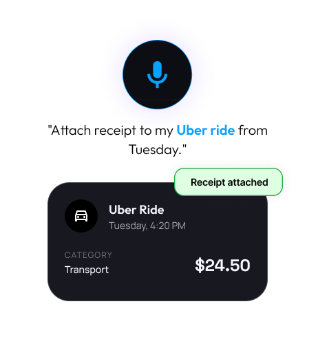 Example voice command: "Attach receipt to my Uber ride from Tuesday"